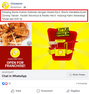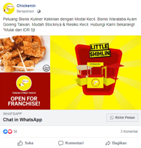 ChickenIn sebagai UMKM yang menjual ayam goreng Taiwan (shihlin) membuat iklan yang mempromosikan jasa franchise. Sehingga mereka membuat konten menggunakan gambar shihlin, booth, dan ditambah dengan tulisan “Open For Franchise”.
